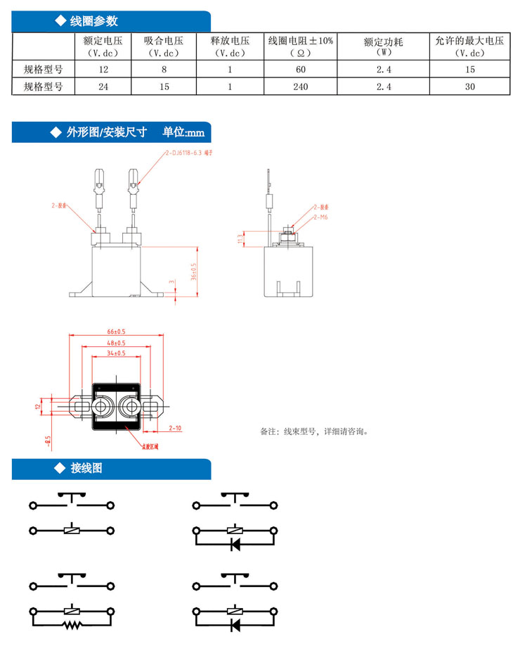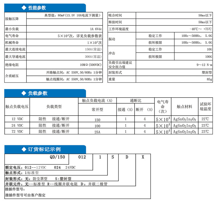 特性: · ●150A觸點切換能力 · ●具有一組常開觸點形式 · ●工作溫度高達75℃ · ●可搭配選用二極管或電阻 · ●符合RoHS、ELV指令 典型應用: 用於汽車電源控製、啟動裝置、暖風機、空調等裝置。