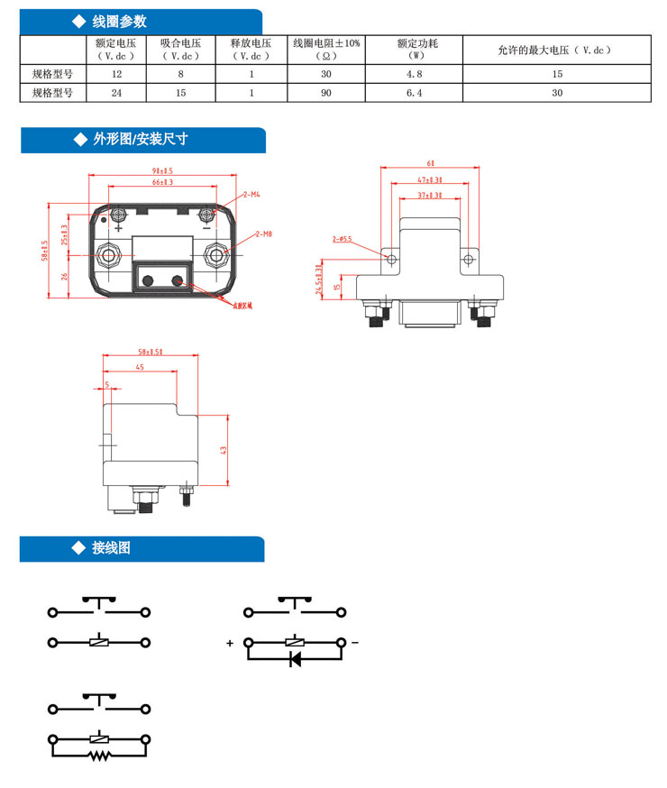 特性: · ●300A觸點切換能力 · ●具有一組常開觸點形式 · ●工作溫度高達75℃ · ●可搭配選用二極管或電阻 · ●符合RoHS、ELV指令 · ●帶有滅弧裝置 典型應用: 用於汽車啟動裝置、電源控製、預熱裝置。